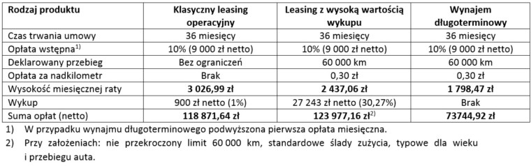 W poniższej tabeli zostało ujęte porównanie klasycznego leasingu operacyjnego, leasingu z wysoką wartością końcową oraz wynajmu długoterminowego dla przykładowego samochodu osobowego o wartości 90 000 zł netto, przy parametrach: Wpłata własna 10%, czas trwania umowy 36 miesięcy, ubezpieczenie AC, OC, NNW, ZK na cały okres trwania umowy.